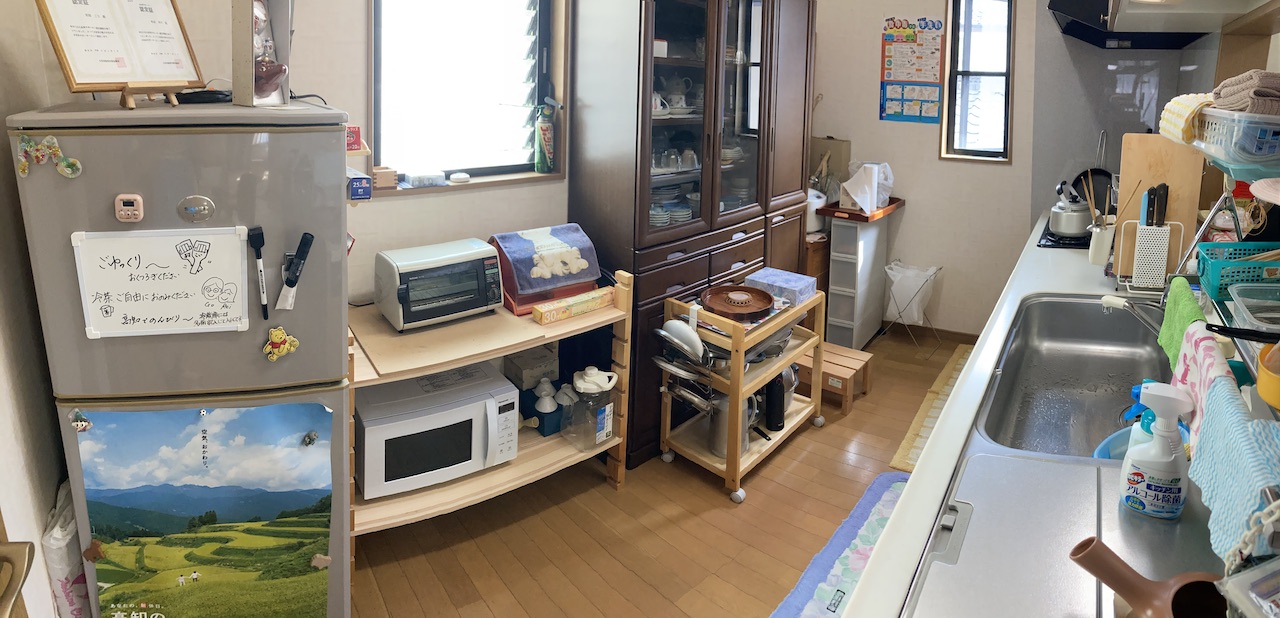 ガスコンロ、冷蔵庫、炊飯器、電子レンジ、トースター、フライパン、鍋、ケトルなどの調理器具や食器などを置いています。
